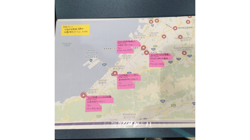 さて、先日の災害対策研修会に参加して、泉州地域の拠点(発電機・蓄電池設置)ステーションについて地図にまとめてみました。